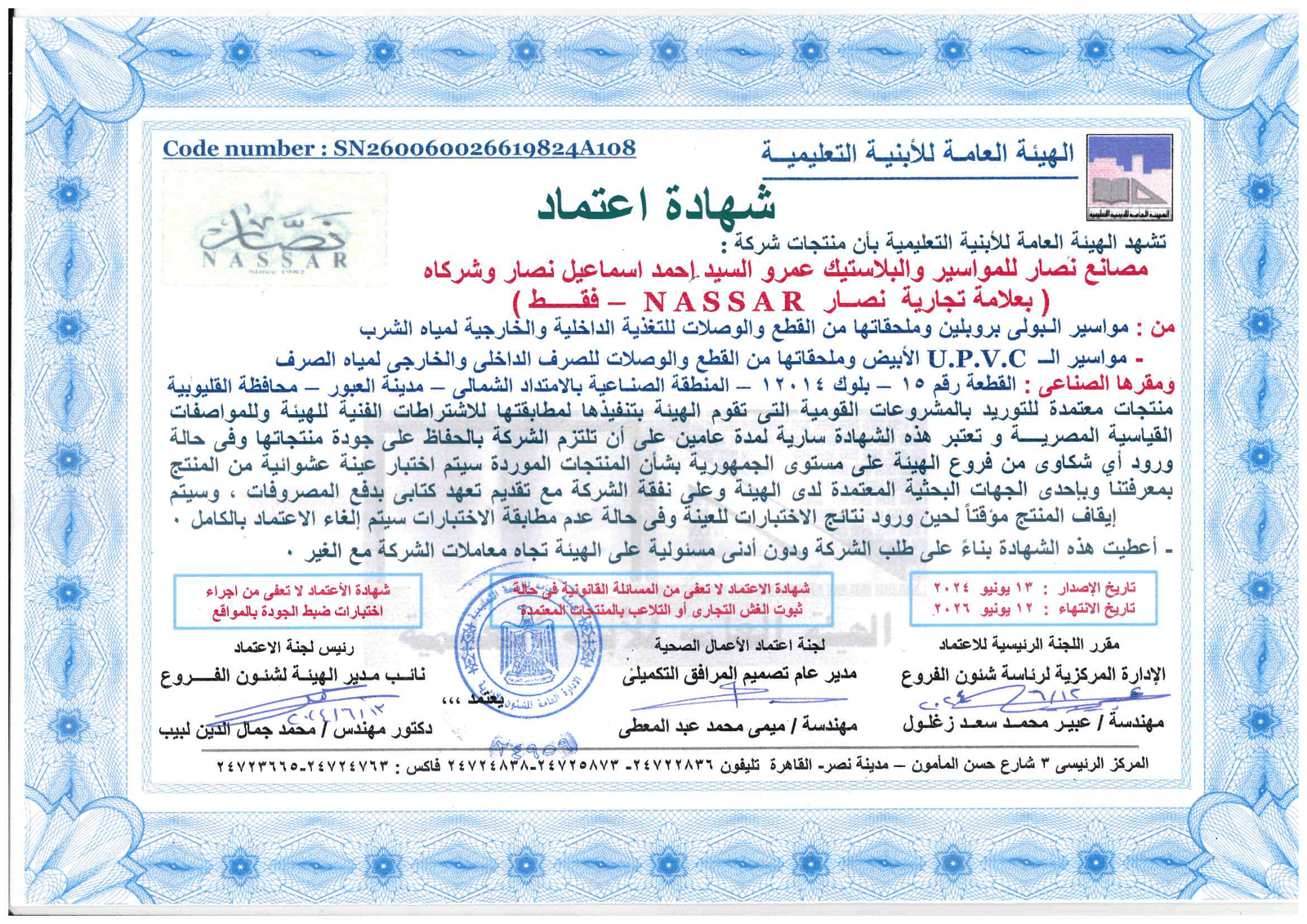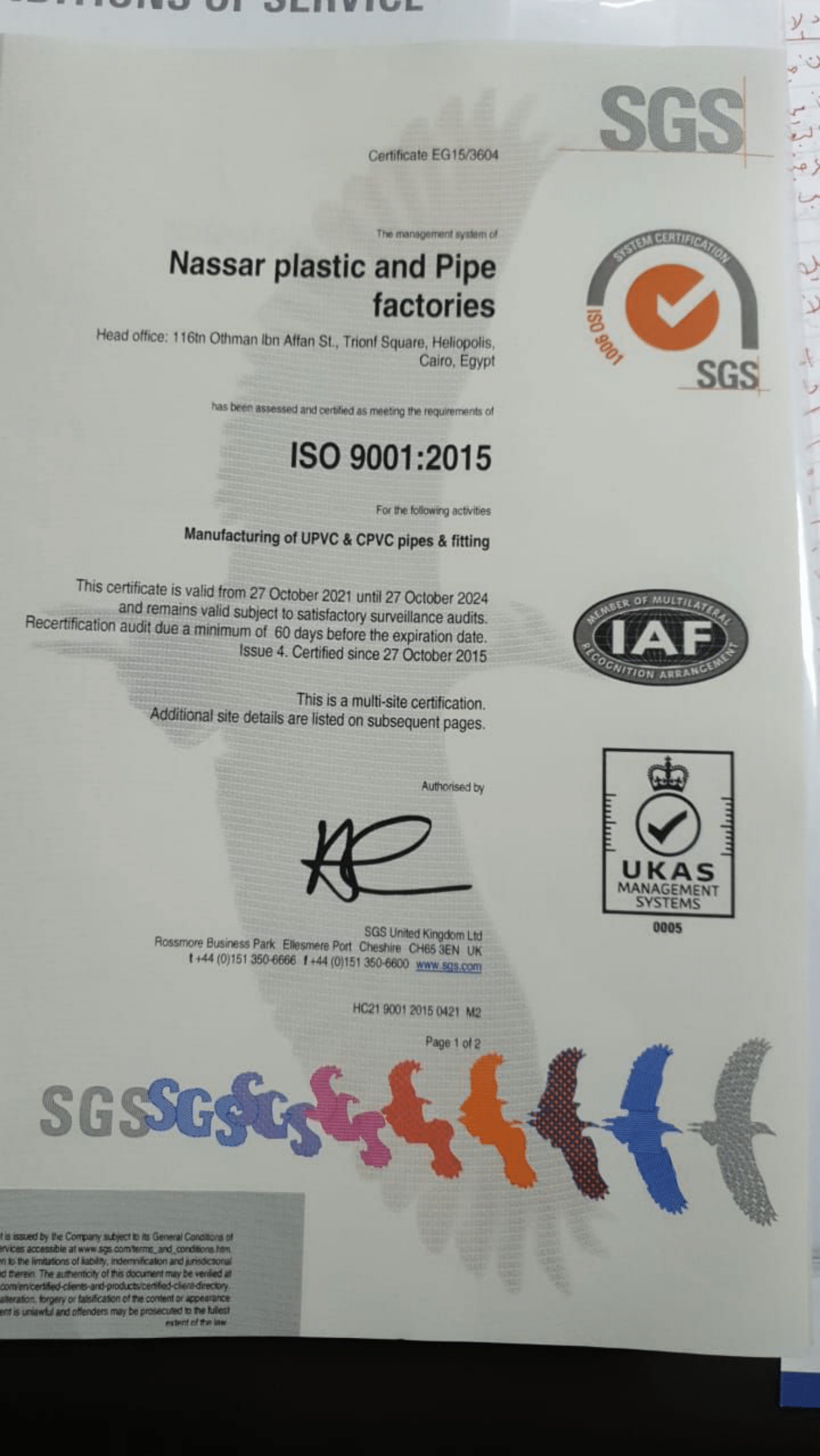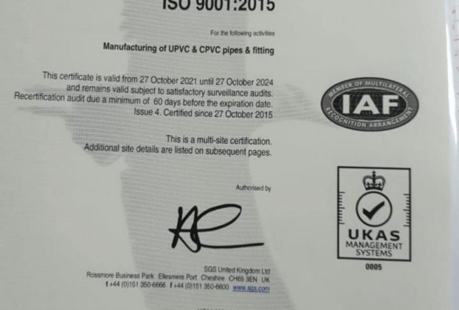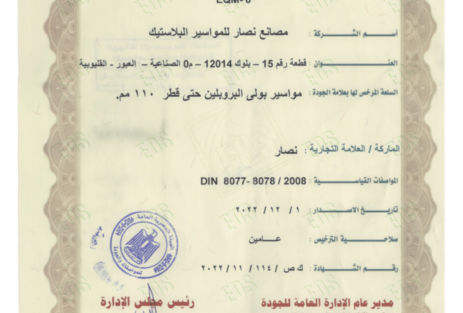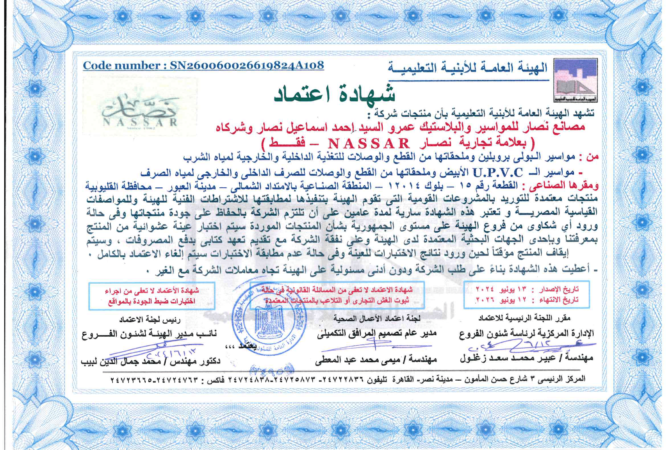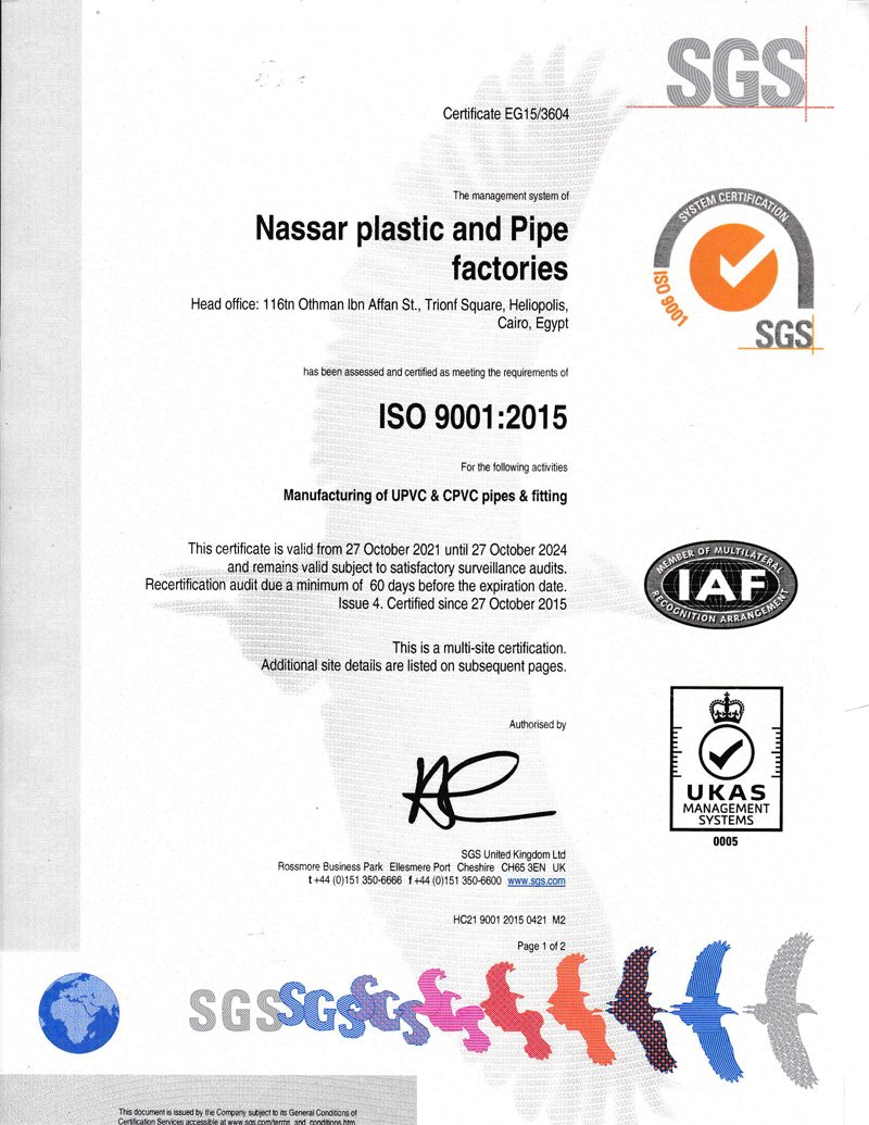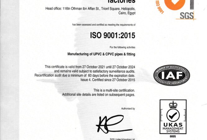 شهادة الأيزو 9001:2015 لتصنيع مواسير ووصلات UPVC.