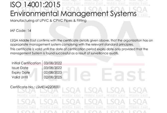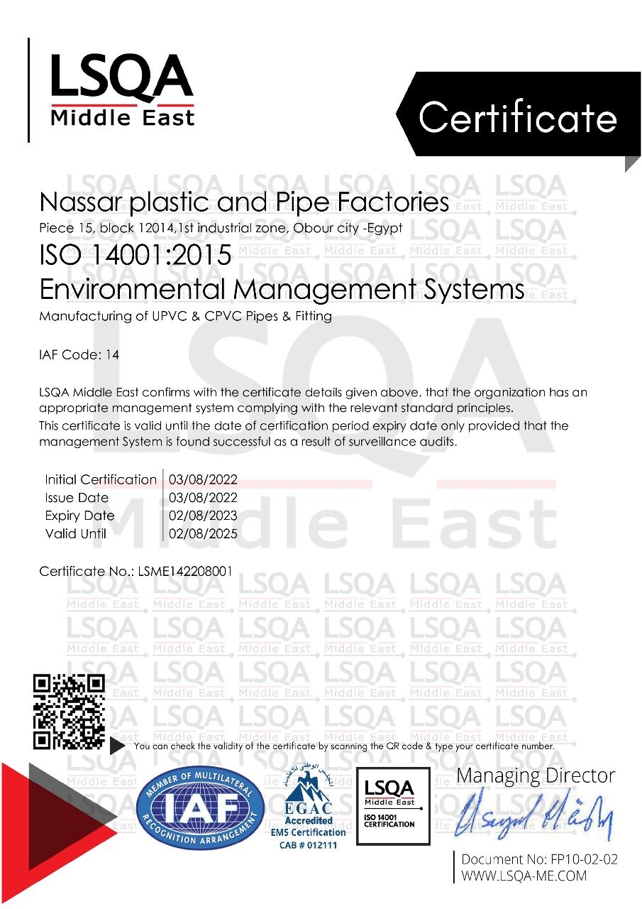 شهادة الأيزو 14001:2015 لأنظمة إدارة البيئة في تصنيع مواسير ووصلات UPVC.