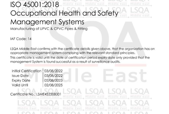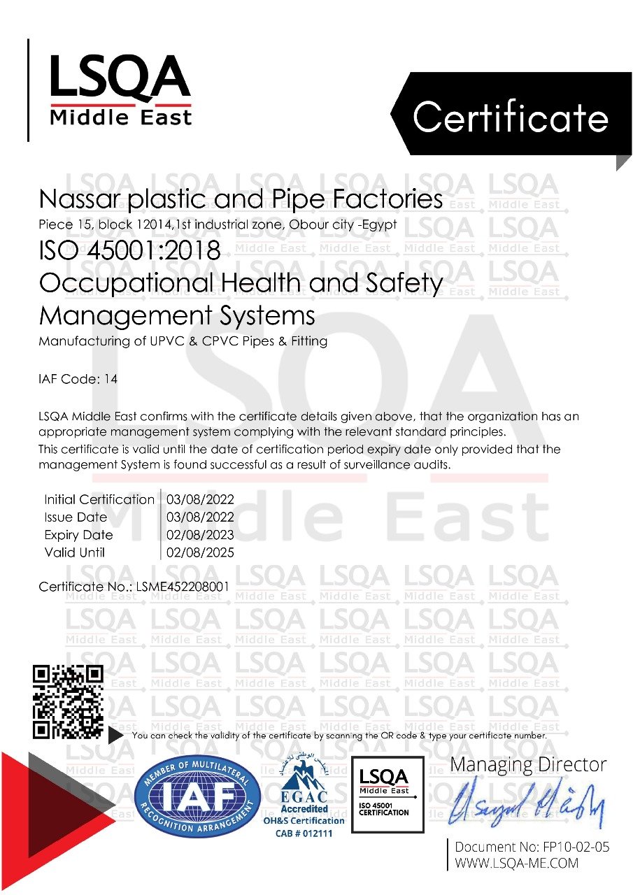 شهادة الأيزو 45001:2018 لأنظمة إدارة السلامة والصحة المهنية في تصنيع مواسير ووصلات UPVC.